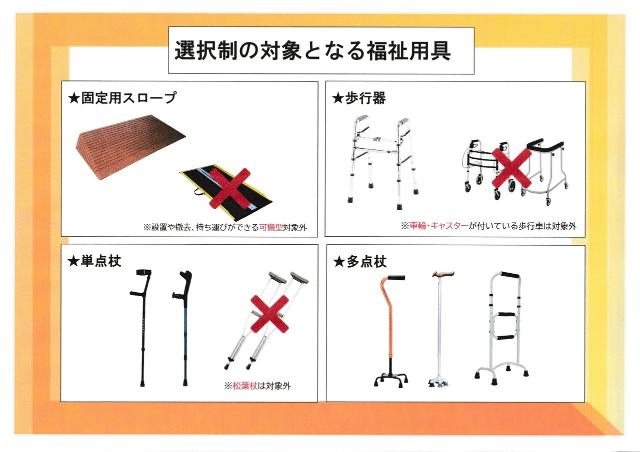 ★固定用スロープ、歩行器(歩行車を除く)、単点杖(松葉杖を除く)、多点杖の4種類の福祉用具です。